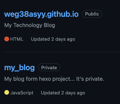 在Github創建好兩個項目,一個是私人的(假設自己的Blog源碼並不打算公開),一個是公開讓大家瀏覽的頁面(Github pages)。