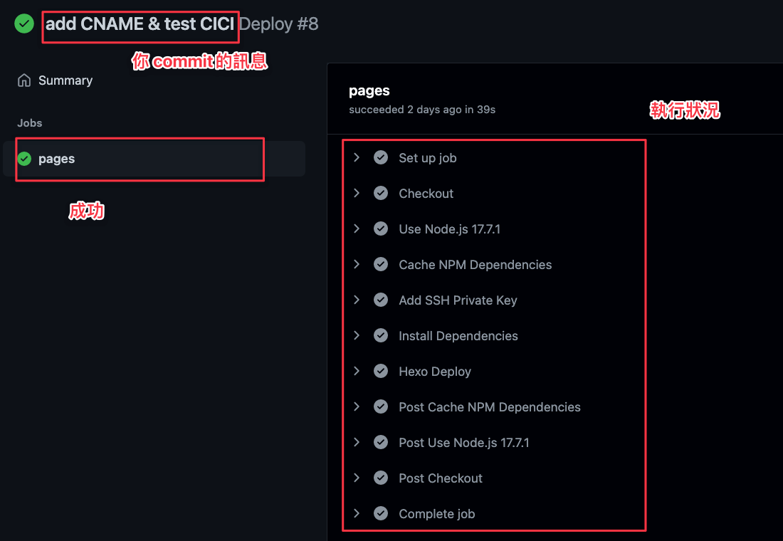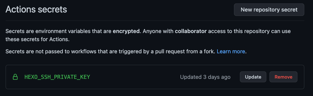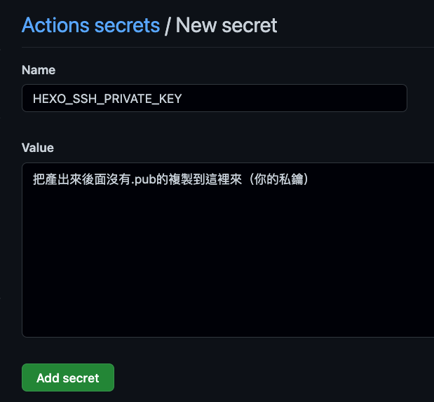 HEXO_SSH_PRIVATE_KEY這個名稱就是在yml配置的名稱,兩邊必須對應,否則會執行.yml程序時,會讀取不到鑰匙。