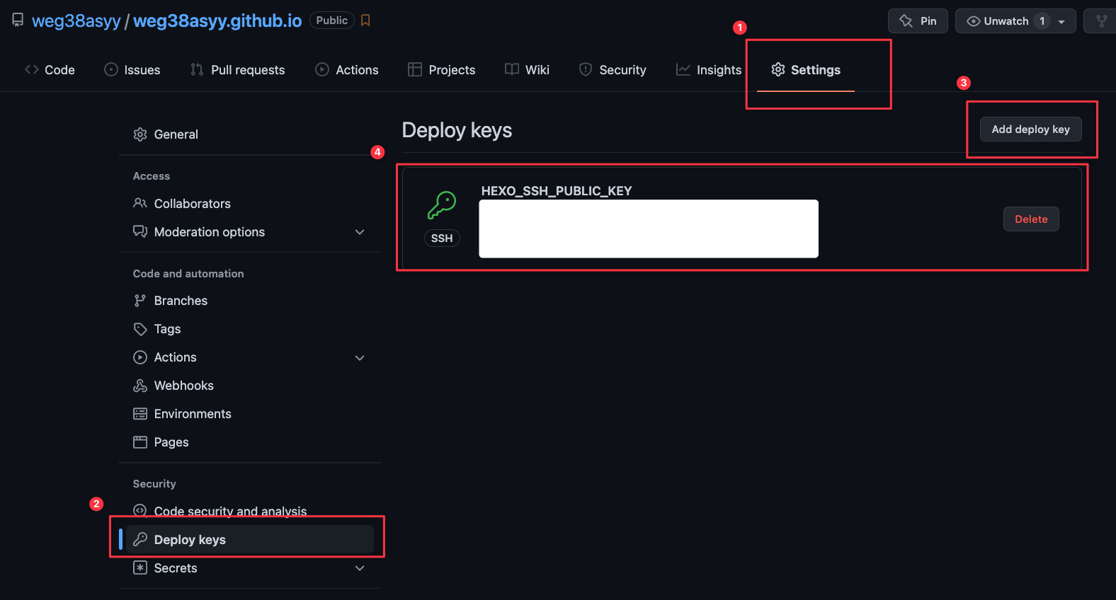 進到你的Github pages項目中,部署公鑰,配置方式同私鑰。
